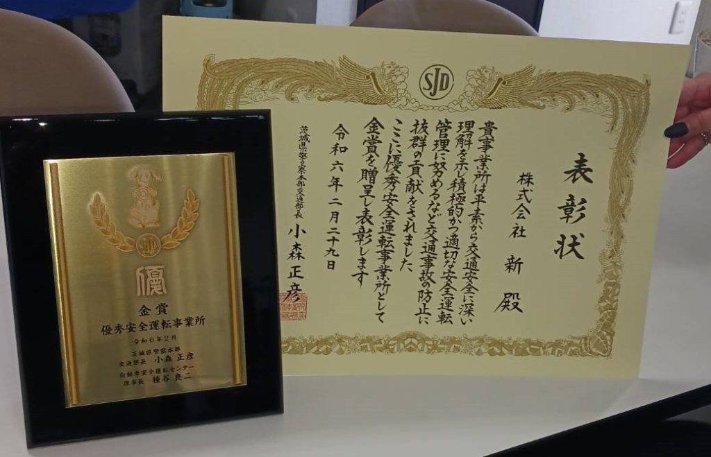 この度、茨城県警察本部交通部長と自動車安全運転センター理事長との連名で優秀安全運転事業所として「金賞」を受賞しました🏆